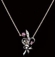 TIFFANY DRAGONFLY PENDANT. Very pretty Tiffany pendant has dragonfly with amber body and yellow eyes with pink, yellow and cream wings against a background of dark blue and emerald green striated glass. Pendant is finished with two green cabochons at the bottom. Unsigned. SIZE: 10″ across x 6-1/2″ l. CONDITION: Very good to excellent. 5-63664 (4,000-5,000)