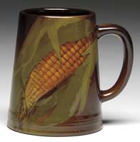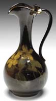 BENNINGTON TYPE LAMP. Very rare Bennington type lamp is attributed to Boston Earthen Works. Lamp has a brown Bennington type foot with stepped brass stem leading to the clear glass mold blown font with pressed vertical loop pattern. Lamp is finished with a clear glass shade with hand etched grape design. SIZE: 17-1/4″ t. CONDITION: Very good to excellent with some minor chips to the glaze on corners of foot. 5-63302 (1,200-1,500)