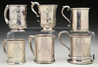 SIX STERLING AND COIN SILVER CHILD’S HANDLED CUPS INCLUDING PEABODY, CABELL, AND GARNETT FAMILY INSCRIPTIONS.