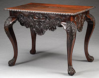 Late 19th century. This fine example with rectangular top and gadrooned edge above conforming frieze. The apron carved in deep relief with scrolling vinery centering a shell within a C-scroll molded frame, the background carved with rows of floral squares. The table raised on bold cabriole legs with molded edge and large scalloped returns centering a carved cartouche of flower heads, scrolling leaf tips, and drapery. Raised on dramatic ball and paw feet with carved knuckles. SIZE: 33-1/2″ h x 44-1/2″ w x 28-3/4″ d. CONDITION: The three board top with tight seam cracks, now stable. Table retains original surface with rich, dark patina. Minimal and minor restoration to edge of apron at leaf tips, now with good French polish. 53021-3 (6,000-8,000) – Lot 1533