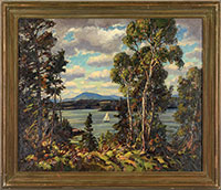 THOMAS R. CURTIN (American, 1899-1977) NEW ENGLAND LANDSCAPE WITH SAILBOAT ON A LAKE