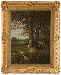 Oil on canvas Housed in a restored antique gold gesso decorated frame with gold liner having artist plaque Signed lower left “James M. Hart 1883″ SIZE: 39″ x 30”. Overall: 53″ x 44″ CONDITION: Lined, some inpainting, very good 53038-6 (4,000-6,000) – Lot 1087