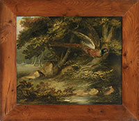 Oil on canvas Housed in a moulded and bronze painted wood frame Bears inscription lower right “A.F.T” SIZE: 22″ x 36″. Overall: 29″ x 43″ PROVENANCE: Contents of a lifetime collection “Brook Crossing,” South Pomfret, VT. CONDITION: Surface grime, discolored varnish, cracks to paint surface in dogs head and birch tree 52806-168 (800-1,200) – Lot 1129