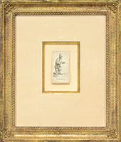 Etching Housed in a modern giltwood frame under glass with linen mat Signed and dated in plate “Rembrandt f 1639” Conceived 1639, from collection of F. Gawet (Lugt 1005), Bartsch 133, Hind 164 and Bjorklund-Barnard 39B; only state Bartsch, 133 SIZE: 3-3/8″ x 1-7/8″. Overall: 15″ x 12-3/4″ CONDITION: Float mounted in frame, affixed to back matting at top two corners, margins trimmed to plate edge, minor discoloration 52851-5 (3,000-5,000) – Lot 1217