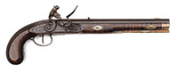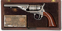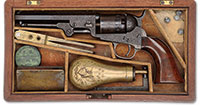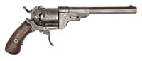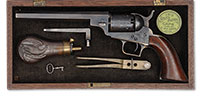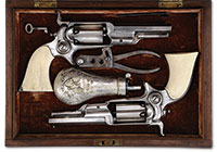 SN 11. Cal. 41. Usual configuration with 21″ oct bbl, integral magazine, German silver front sight and an orig adjustable Volcanic rear sight in the top flat of receiver. Top flat of bbl has the New Haven address and “1854” patent date. Mounted with uncheckered straight grain American walnut buttstock that has straight grip and crescent brass buttplate. Receiver & buttplate tang are engraved in early Volcanic style with light foliate arabesque patterns and a ribbon on the left sideplate engraved “T.R. Phelps / NEW YORK”. Left side of lower tang has the SN “11” which number is also found on left side of lever loop, inside top tang channel of buttstock, on heel of buttstock and inside buttplate tang. No additional disassembly was effected to check for other matching numbers. Magazine follower is a replacement. The engraving patterns and the inscription are very unusual but undoubtedly are authentic and orig to this carbine. An identically engraved Volcanic pistol is pictured on p. 23 of the book The Henry Rifle, Quick. PROVENANCE: Tommy Rholes Estate Collection. CONDITION: Very good, all matching. No orig finish remains with the steel parts a mottled medium brown patina; receiver & buttplate retain a medium to dark mustard patina with a few light nicks & scratches. Buttstock is sound with usual light handling nicks & scratches, some oil staining around the tangs and retains most of an old applied finish. Mechanics are fine, strong bore with good shine & scattered pitting. 4-50742 JR1 (15,000-25,000) – Lot 1000