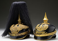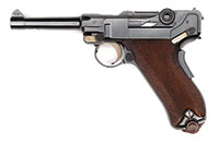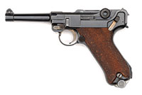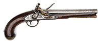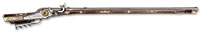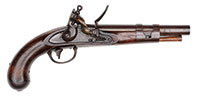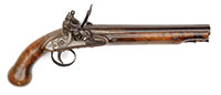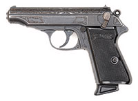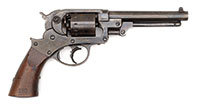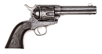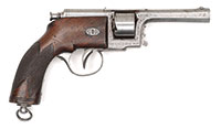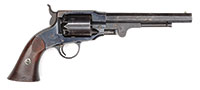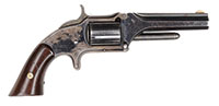 SN 1633. Cal. 44 RF Henry. Early rifle with 24-1/4″ oct bbl that has integral magazine, altered orig German silver front sight and fixed rear sight in the bbl seat with an empty seat in the top flat of the receiver. Mounted with nicely figured, uncheckered American walnut buttstock with straight grip and early style brass buttplate with round heel and large trap with a corresponding large recess underneath to accommodate a 4-pc hickory cleaning rod, which is not present. Left side of buttstock has a factory sling swivel with corresponding loop on bbl. This rifle has early features including the perch belly stock, round heel on the buttplate, small tab cartridge follower, small finger loop on the lever and small trigger pin. Left side of buttstock, between sling swivel & buttplate is branded with the large intertwined initials “PS”. SN is found in the usual places on the top flat of the bbl between the rear sight and receiver, left side of lower tang under the wood, top tang channel of the buttstock and inside toe of buttplate. All of the receiver & buttplate screws are also matching numbered. Round portion of the bbl under the loading sleeve has the assembly number “408” with matching number on rear face of loading sleeve. Receiver & buttplate tang are most unusually engraved in a style like known factory engraved Volcanic pistols & carbines. Engraving consists of extremely well-executed foliate arabesque patterns with very detailed shading and square & dot patterns on the raised area forward of the sideplates. Engraving extends over the top of the receiver, top tang and buttplate tang with a foliate type pattern on each side of the receiver at the rear edges. A Volcanic pistol with nearly identical engraved patterns is pictured on p. 23 of The Henry Rifle, Quick. There are numerous other examples of identical engraving on Volcanic arms found in several other publications including The Winchester Book, Madis, Winchester Engraving and The Book of Winchester Engraving, Wilson. No examples of this engraving pattern have ever been previously seen by this cataloger on a Henry rifle. This rifle was produced in about 1862 or 1863, during the height of the Civil War when few engraved rifles were ordered, and in fact special ordered rifle were discouraged. The Henry factory was having trouble keeping up with demand for standard model orders. In addition, by this time the majority of known engraved Henry rifles were engraved by Samuel Hoggson, L.D. Nimschke or one of the Ulrichs, all of whose work was much finer and more detailed. Therefore it seems likely that this rifle may have been for an employee or someone of lesser importance. It is also a possibility that the engraving was applied at a later date. PROVENANCE: Tommy Rholes Estate Collection. CONDITION: Very fine, all matching. Bbl & magazine tube retain small amounts of bright orig blue in the gullets with the balance having turned to a smooth, even plum patina; receiver shows light sharp edge wear around the bottom edges with the other edges sharp & crisp and overall retains a dark mustard patina; buttplate has a matching patina; lever & hammer are a dark plum patina. Buttstock is sound with nicks, dings & scratches and retains 85-90% strong orig varnish. Mechanics are fine, bright shiny bore with fine frosty pitting. 4-50652 JR4 (25,000-40,000) – Lot 1003
