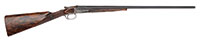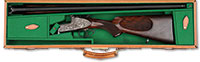 SN 324NN03000. Cal. 20 ga. 3″ Chambers. 28″ Bbls with narrow, ventilated rib, are choked improved cylinder and improved modified. Left side of top bbl is engraved in script “Browning FA – Made in Belgium”, right “Mod B 25 – 20 ga – 3″”. Coin finished, well sculpted, side-plated action is engraved with very well cut, large, flowing scrolled acanthus with shaded background, and large beaded borders surrounding semi-relief gold-inlaid quail on bottom. Sideplates have more broad scroll surrounding vignettes of game birds gold inlaid in semi-relief; a trio of pheasants are on left, with three ducks on right. Gold wire borders are around lockplates and top of action. A well rendered portrait of a Labrador is on trigger guard bow. Top lever is pierced in scroll design. This fine work is signed by engraver, J. P. Bailly, on trigger plate. Gold plated trigger has checkered finger blade. Exceptional, intricately marbled, European walnut straight grip buttstock measures 14-1/2″ over skip line checkered wood butt. Modified point pattern checkering continues over grip. Stock features nicely carved fluted drop points. Schnabeled three piece superlight forend matches perfectly. Drop at heel: 2-1/16″. Drop at comb: 1-3/8″. Weight: 6 lbs. 0 oz. LOP: 14-1/2″. Tan leather case with leather corners is lined in green felt, and has Browning Custom Shop leather label on lid. Case contains burgundy colored Custom Shop socks for bbls and action, and straps. Case also contains spare action screws in taped up match box. PROVENANCE: Correspondence between original buyer and factory concerning details of the building of this gun. CONDITION: Excellent, essentially as new, with only the slightest of handling marks in wood and metal. Case is excellent, as is interior. 4-51915 MGM213 (20,000-30,000) – Lot 3575