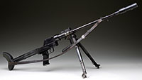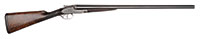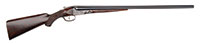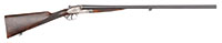 SN 171J74. Cal. .410. 3″ Chambers. 26-3/8″ Bbls with ventilated rib are choked modified and full, and are marked with usual Browning Arms addresses and information on top bbl along with “MADE IN BELGIUM”. Typical gray finished action is engraved with small shaded scroll with beaded borders framing vignettes of dogs retrieving birds; a retriever has mallard on left, and a pointer is retrieving a pheasant on right. Bottom of action depicts a pair of grouse, and a pair of pheasant, one resting, the other flushing, on trigger guard bow. Engraver’s signature, M. Bodson, is at bottom of left hand scene. Striking dark flame/ burl figured claro walnut straight grip buttstock measures 14-1/4″ over Browning composition buttplate. Point pattern checkering with double line borders is at grip. Schnabeled superlight forend matches buttstock well. Drop at heel: 1-3/4″, drop at comb: 1-1/2″. Weight: 6 lbs. 5 oz. LOP: 14-1/4″. PROVENANCE: Factory letter confirming specifications, and indicating that it was shipped Oct. 28, 1974. CONDITION: Excellent, essentially as new, appears unfired except for proof, with only the slightest hint of assembly mark on bottom bbl, and some light rubs and a couple of marks in gloss finish of stock, with some exceptionally small areas of lifting on right side of forend. Mechanically crisp. 4-51912 MGM197 (15,000-25,000) – Lot 3574