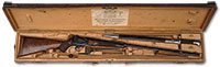 SN 6065. Cal. 44 RF Henry. Usual configuration with 24-1/4″ oct bbl that has integral magazine and late style, square back German silver front sight with fixed sight in rear seat and no dovetail on receiver. Mounted with very highly figured, uncheckered American walnut buttstock with late style brass buttplate that has pointed heel and small trap containing an orig 4-pc brass & steel cleaning rod. Buttstock has a deluxe high gloss finish. Receiver and buttplate tang are engraved by Samuel Hoggson in his typical patterns with a bird dog on point on left sideplate and excellent foliate arabesque scrolls elsewhere with a fine stippled background. Both front side flats are engraved with Mr. Hoggson’s distinctive large flower blossom and the engraving is all surrounded by a double border. Engraving patterns extend over the top of the receiver, around rear edge of receiver, top tang and buttplate tang. SN is found in usual places, top flat of bbl between rear sight & receiver, left side of lower tang under the wood, top tang channel of buttstock and inside toe of buttplate. Round portion of bbl, under the loading sleeve is marked with assembly number “789” with matching number on rear face of loading sleeve. This exact rifle, identified by SN, is pictured on pg 30 of The Henry Rifle, Quick with credit to the Tommy Rholes Collection. PROVENANCE: Tommy Rholes Estate Collection. CONDITION: Very fine, all matching. Bbl & magazine tube retain 75-80% strong orig blue with the balance a blue/gray patina; receiver & buttplate retain strong edges showing only light wear around bottom of receiver and overall retains a medium to dark mustard patina; hammer retains moderately faded case colors; lever is mostly a gray to brown metal patina. Buttstock is sound with light nicks & scratches and overall retains about 95% bright varnish finish. Mechanics are fine, bright shiny bore with scattered light pitting. 4-50617 JR5 (40,000-60,000) – Lot 1001