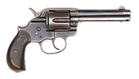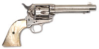 SN 189964. Cal. 44 WCF (44-40). Standard grade carbine with 20″ bbl, full magazine, barleycorn front sight & 1873 marked carbine ladder rear sight. Left side of receiver has a staple & ring. Mounted with highly figured, uncheckered, shell grain American walnut with straight stock & carbine buttplate with trap containing an orig 3-pc nickel plated brass & steel cleaning rod. Full nickel finish guns such as this were usually for wild west showmen or trick shot artists. PROVENANCE: Tommy Rholes Estate Collection. CONDITION: Very fine. Bbl retains about 80% strong orig nickel showing wear around the rear sight at the carry point. Magazine tube retains about 95% strong orig nickel with some very minor flaking. Receiver & side plates overall retain about 75-80% orig nickel with fine flaking & two cleaned areas on the left side with the balance of the nickel strong & bright. Buttplate retains about 75% orig nickel. Mechanics are fine. Bright shiny bore. 4-50746 JR46 (10,000-15,000) – Lot 1024