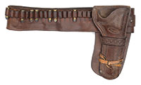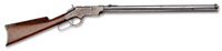 SN 148059. Cal. 38 WCF (38-40). Special order deluxe ’73 with rare 28″ oct bbl, full magazine, half nickel front sight and semi-buckhorn rear sight. Receiver is color case hardened and has sgl set trigger. Mounted with very highly figured, center crotch, flame grain American walnut with H-style checkered forearm and black horn fleur-de-lis insert, serpentine grip buttstock that has crescent buttplate with trap. Left side of lower tang, under the wood, is marked with the assembly number “5380”, “XXX” and an “R”. It also is marked “38” which apparently indicates the caliber and the “R” represents the crescent buttplate. Accompanied by a Cody Firearms Museum letter which identifies this rifle in caliber 38 with 28″ oct bbl, set trigger, checkered pistol grip stock and case hardened, received in warehouse May 7, 1884 and shipped same day to Order #12250. This rifle was produced during the height of the great westward expansion when repeating firearms were in great demand. Hunting and self protection firearms were necessary tools and most all business and pleasure were conducted from the back of a horse, wagon or buggy which exposed these firearms continuously to harsh elements, usually with little maintenance. Few of them are found today with high orig finish. PROVENANCE: Tommy Rholes Estate Collection. CONDITION: Very fine, all matching. Bbl & magazine tube retain 96-98% strong orig blue turning a little plum with wear only on the very sharp edges and outer radius of the magazine tube; receiver & sideplates retain most of their orig case colors, strong & bright in sheltered areas, fading elsewhere; lever & hammer retain strong case colors, turned silver on outer faces of lever; buttplate retains 50-60% faded case colors with pitting on heel & toe. Wood is sound with a couple of bruises on forearm and light nicks & scratches elsewhere and overall retains nearly all of its orig bright piano varnish finish. Mechanics are fine, bright shiny bore. 4-50642 JR20 (20,000-35,000) – Lot 1018