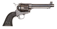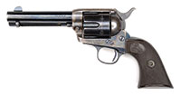 SN 30863. Cal. 44 WCF (44-40). Fine deluxe ’73 with 24-1/4 oct to rnd bbl, button magazine, ivory bead Beach’s combination front sight, short semi-buckhorn rear sight with checkered edges and a thick base sporting tang sight with 4″ staff. Mounted with highly figured, flame grain, center crotch American walnut that has early style checkered forearm and straight stock with crescent buttplate with trap. Receiver is 2nd type with attached rail mounting and impressed thumbprint dust cover. Left side of lower tang under the wood is marked with the assembly number “105” which number is also found, in pencil in the top tang channel of buttstock and inside toe buttplate. Accompanied by a Cody Firearms Museum letter which identifies this rifle with 1/2 oct bbl, plain trigger, checkered stock, peep & Beach sights, 1/2 magazine and case hardened, received in warehouse Sept. 28, 1878 and shipped June 27, 1879 to Order number 15979. There is another ship date of Oct.2, 1878, Order #13242 which is crossed out. This rifle was produced at a time when business or pleasure was conducted from the back of a horse, wagon or buggy which exposed these firearms to the harsh elements usually with little maintenance. Firearms of this era are rarely found today with high orig finish. PROVENANCE: Tommy Rholes Estate Collection. CONDITION: Very fine. Bbl retains 85-88% orig blue showing sharp edge wear on the oct section and thinning on the rnd section. Receiver and side plates retain about 80% orig case colors, moderately to heavily faded, stronger on the left side, turned silver on the bottom; lever & hammer retain strong case colors, faded to silver on outer faces of lever. Forearm has about a 3″ repaired crack by the bbl channel at the left front end, otherwise wood is sound with light nicks and scratches. Buttstock retains about 95% strong, orig piano varnish finish and forearm retains most of a restored finish. Mechanics are fine. Bright shiny bore. 4-50521 JR28 (22,500-32,500) – Lot 1016