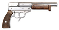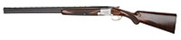 SN 437J83. Cal. .410. 3″ Chambers. 28″ Bbls with ventilated rib are choked modified and full, and are marked with usual Browning Arms addresses and information on top bbl along with “MADE IN BELGIUM”. Typical gray finished action is engraved with small shaded scroll with beaded borders framing vignettes of dogs retrieving birds; a setter is carrying mallard on left, and a pointer is retrieving a pheasant on right side of action. Bottom of action depicts a pair of grouse. A pair of pheasant, one resting, the other flushing, are on trigger guard bow. Engraver’s signature, R. Capece, is at bottom right of action. Strikingly marbled and lightly figured claro walnut straight grip buttstock measures 14-1/4″ over Browning composition buttplate. Modified point pattern checkering is at grip. Schnabeled superlight forend matches buttstock well. Drop at heel: 2-1/8″, drop at comb: 1-1/4″. Weight: 6 lbs. 8 oz. LOP: 14-1/4″. PROVENANCE: Letter from Jaqua’s Fine Guns indicating that this is one of the “final series of all Belgian .410’s.” and consignor states that it “originated from Robert Peterson Museum”. CONDITION: Excellent, essentially as new, appears unfired except for proof, with only the slightest hint of assembly mark on bottom bbl, and some light rubs and a couple of marks in gloss finish of stock. Mechanically crisp. 4-51910 MGM190 (15,000-25,000) – Lot 3576
