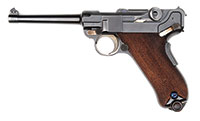 SN P23PM1562. Cal. 20 ga. 2-3/4″ Chambers. 26-3/8″ Bbls with ventilated rib are choked modified and improved cylinder, and are marked with usual Browning Arms addresses and information on top bbl. Typical gray finished action is engraved with large, scrolled acanthus with shaded background, framing vignettes of five pheasants on left, four ducks in marsh on right, and a pair of quail on bottom of action. A pair of rabbits is on trigger guard bow. Game scene engraver’s signature, J. Pirotte, is at bottom right of pheasant scene. Craftsman responsible for the well cut scroll, F. Pauwels, has signed the trigger plate. Spectacular flaming crotch figured oil finished claro walnut straight grip buttstock measures 14-3/8″ over checkered wood butt. Modified point pattern checkering is at grip. One piece schnabeled superlight forend matches well. Drop at heel: 2-1/8″, drop at comb: 1-3/8″. Weight: 6 lbs. 1 oz. LOP: 14-3/8″. Brown patterned vinyl Browning case is lined in faux fur. Dull black red and gold Browning box has end label that matches specifications of this gun. Box contains instruction booklet, Browning patch, Browning advertising, as well as wrapping tissue. PROVENANCE: Factory letter confirms all specifications and indicates that this gun was shipped on Jan. 13, 1986. CONDITION: Excellent, showing little use, with only the slightest hint of assembly mark on bottom bbl. There are a few marks in wood. Mechanically crisp. Case is excellent. Interior has some slight compressions and minor soiling. Box is excellent, with a few minor chips on edges and corners, and a small tear on top. End label is very fine. 4-51905 MGM203 (12,500-22,500) – Lot 3583
