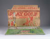 LOT OF SIX GOLF MUGS AND BOOKLET. Ceramic mugs feature illustrations of golfers with instructions for putting, pitch shots, uphill lie, etc. Mugs marked “Stevenson Co. Inc. Navesink, NJ” on bottom of cups. Booklet titled On the Links dated 1926 is a hard bound comic book. SIZE: Mugs 4-1/2 ” t. CONDITION: Very good. PF 1-1900 (50-100)
