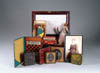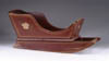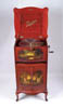 MINIATURE SPINNING WHEEL. Early collapsible handcrafted wheel with highlights in old red paint. SIZE: 23″ h x 17″ l. CONDITION: Some chips to wood, minor worm damage, generally good. 1-2846 (100-300)