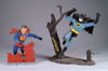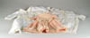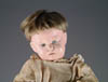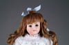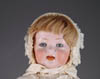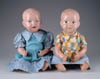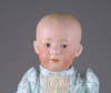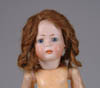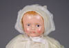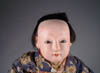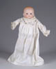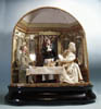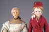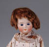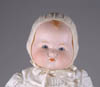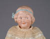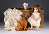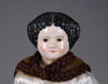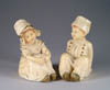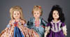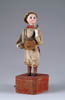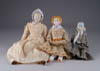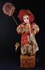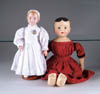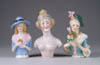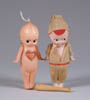 LOT OF THREE COTTON BATTING CHRISTMAS ORNAMENTS. The first being a pair boy and girl holding trees with composition heads affixed to wired armature body covered in cotton and gaily painted with mica applied. The third being a young lady holding a Christmas tree with a composition face on a wired armature body covered in white cotton batting, white coat, muff and boots with mica applied. SIZE: 5” +/-. CONDITION: Overall condition is very fine. Single girl has drop of glue residue on face. JL 1-2671 (200-300)