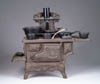 LOT OF 2 GAS POWERED STEAM IRONS. Porcelain bases. 1) American Gas Machine Co. in black with plaque. 2) Blue porcelain Coleman. Both with nickel plated rear tanks and . SIZE: 10″ l. x 6-1/2″ h & 11″ l x 7″ h, respectively. CONDITION: Black example is very good to near excellent, blue example has porcelain chips and some crazing, some dulling to the nickel, otherwise good to very good. 1-2137-1033 (100-200)