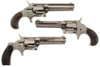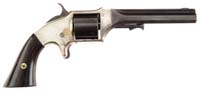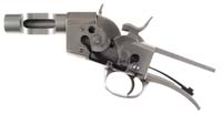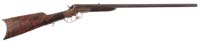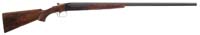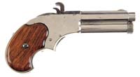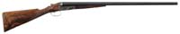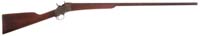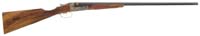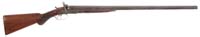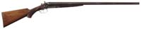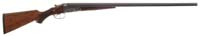 RARE TINY ARMY & NAVY DOUBLE BARREL HAMMER SHOTGUN. Cal. 410. SN 59203. Dainty little shotgun with 27-1/8” bbls choked FULL/IMP-CYL with tapered, concave, smooth rib, sgl bead, dbl underbites & extractor. It is nitro-proofed and has 2” chambers. Mounted with nicely figured English walnut with checkered splinter forearm & straight stock, 13-1/2” over a serrated butt. There is a blank initial oval on bottom. It has a tiny, undecorated rnd action with peninsula back action locks that are marked with company name on both sides. Unable to gage bore diameter, bore restriction or wall thickness. Drop at heel: 1-7/8”, drop at comb: 1-1/4”. Weight: 4 lbs. 4.8 oz. CONDITION: Fine to very fine. Bbls retain strong, orig blue turning plum. Receiver & lockplates retain brilliant case colors in sheltered areas with balance fading to silver and mixed with light patina on bottom of receiver. There is an inside crack in forearm, not showing through, otherwise wood is sound with normal handling & use marks showing light wear and retains most of its orig finish. Mechanics are fine, bright shiny bores. 4-58760 JR652 (500-1,000)