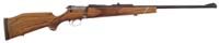 *FINE RIGBY MAUSER-ACTION CUSTOM BOLT ACTION RIFLE. Cal. 270 Win. SN 6387. Beautiful bolt action hunting & sporting rifle with 24″ sporter weight, tapered, rnd bbl, engraved on the top “J. Rigby & Co. London, England”. Left side of receiver ring is engraved “CALIBRE/.270 WINCHESTER” right side is engraved “Made in/England”. Receiver is mounted with bases & rings containing a Zeiss Diatal-Z 6X42 Scope with three heavy posts & crosshair reticle. Bolt knob has two panel checkering. Mounted in very nicely figured, 1-pc English walnut stock with fine checkered forearm and capped pistol grip with Monte Carlo comb & cheek piece with solid red rubber pad. It has sling swivel studs in buttstock & forestock. The reinforcing crossbolt is nicely engraved on each end, and it has a thumb safety on the right side. CONDITION: As new, has been fired, but very little. Retains virtually all of its orig factory finish to both metal & wood. Mechanics are fine. Crisp optics and brilliant shiny bore. 4-59148 (4,500-7,500)
