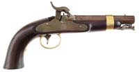 RARE EVANS FLINTLOCK MARTIAL PISTOL. NSN. Cal. 73. 8-1/2” rnd bbl. Marked “EVANS” on the lock plate. This is a copy of the French ANXIII martial pistol. There was no official contract for these pistols, but this, like all the other known specimens, has a large, sunken “P” proof mark at the rear of the bbl. There are no assembly marks inside the lock, and the parts are somewhat crudely filed. Ramrod is a replacement. CONDITION: Metal has been cleaned, but some pitting remains. Stock has been repaired, sanded, and refinished, with chips and cracks remaining. Bbl band is loose. Lock is functional. 4-58284 FS31 (2,000-3,000)