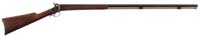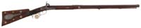 MULLER DOUBLE BARREL PERCUSSION SHOTGUN. NSN. 16 ga. 34” ribbed bbls. “A MULLER a SAALFELD.” is inlaid in silver on top of the bbl rib. The engraved locks have rotating safeties in front of the hammers. The German silver triggerguard has a pineapple finial with a swan on the bow. The stock is relief carved at the wrist and behind the cheekpiece with floral scrolls. The ramrod has a bone tip and is missing the cover for the worm at the other end. The leather sling has been repaired. CONDITION: Gray/brown patina with edge wear on the bbl, moderate to heavy wear on the checkering. Mechanically good. Wm. Hancock Collection 4-58564 FS786 (1,000-2,000)