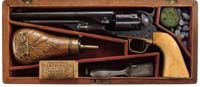FINE J. POWELL & SON PERCUSSION DOUBLE BARREL SHOTGUN. Cal. About 11 bore. NSN. Fine English made shotgun with 28-1/2” laminated steel bbls with smooth, concave rib, marked with maker’s name & address. There are wide & narrow gold bands at breech end of rib. It has front action locks with dog ear hammers, nicely engraved with foliate arabesque patterns with trigger guard engraved to match. Mounted in very nicely figured, French walnut with checkered forestock secured with a sgl wedge through engraved escutcheons & straight stock, 14-1/4” over a smooth steel buttplate with long, stepped, engraved tang. Accompanied by a very early, walnut casing with the name “J.R. CRANDALL” painted on top. It is green velvet lined & compartment in bottom for shotgun and miscellaneous tools. There is a laquered Eley’s cap tin with brass repoussed top filled with a white powder and a smaller Eley’s cap tin filled with miscellaneous nipples and replacement turn screw blades for nipple wrench/turn screw handle also in the case. There is a wad cutter and a curious small set of nippers and a spring vice. Additionally and incongruously there is an empty cartridge box for 44-100 rifle cartridges by Crittendon & Tibbles with a picture of a Ballard rifle. There are also miscellaneous jags, brushes & mops for the orig cleaning rod. CONDITION: Good to very good. Overall retains 25-30% thin twist pattern, being mostly a silver metal color. Lockplates retain case colors in sheltered areas with balance of metal a cleaned silver metal color. Wood is sound with numerous small nicks & scratches showing heavy wear and retains about 50% orig varnish. Mechanics are fine, smooth clean bores with a small ring about 6” from muzzle of left bbl. Exterior of case is fine, having a couple of grain checks in lid and four or five more in bottom. Lining is lightly faded with a few loose partitions. Cartridge box is soiled with water damage & one broken end. 4-60271 (2,000-3,000)