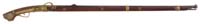 JAPANESE MATCHLOCK MUSKET. NSN. 54 Cal. 41-3/4” fluted oct bbl. Silver tree branches inlaid on the bbl at the breech. Bbl pin escutcheons have a leaf form. There are also leaf inlays on the butt. The ramrod is a replacement. CONDITION: Dark patina on bbl and moderate to dark patina on brass. Stock is cracked along the ramrod channel with some areas of repair. Mechanically fine. Wm. Hancock Collection 4-58597 (1,000-1,500)
