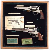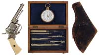CASED PAIR OF WESTLEY RICHARDS TRAVELER’S PISTOLS. Cal. About 65. NSN. Fine brace of pistols with 8” damascus oct bbls with maker’s name on top flat. They have a brass bead front sight with a fixed rear sight mounted to breech plug. Tangs & breech plugs are beautifully engraved. They have short, slightly curved lockplates with flat side, reinforced hammers, both nicely engraved. They have sliding safeties with roller frizzens, scalloped pans & shields with platinum lined flash holes. Simple trigger guards are nicely engraved. They have lightly decorated iron nose pipes with captive rammers. They are mounted in nicely figured 1-pc stocks with raised teardrop side panels & rnd-butt grips with flat checkering. Accompanied by a green, baize lined, oak casing, probably not for these pistols, compartment for pistols & other implements, but have only a brass tipped rammer & an iron tipped worm. Both have ebony handles. Also included is a tiny, smooth, Dixon style bag flask, probably not for this set. Inside lid is label for “EDWARD LONDON, / GUNMAKER / 51 LONDON WALL, LONDON”. CONDITION: Pistols are extremely fine, nearly new. With both being in about identical condition. They retain most of their orig maker’s finish with fine brown Damascus pattern & case hardened lockplates, hammers & top tangs. Stocks are sound with light handling & use marks, mostly on left sides and retain virtually all of their orig varnish. Trigger guards & nose pipes retain most of their orig blue with one pistol being a little stronger than the other. Case has a repaired lid & is moderately soiled & faded inside with soil, stain & moderate to heavy storage marks on outside, with an old refinish. Interior has probably been reconfigured for these pistols. Flask retains traces of orig finish with a dent & some pitting. Ramrod handle has a gouge, otherwise tools are fine. Wm. Hancock Collection 4-58580 JR426 (7,500-10,000)