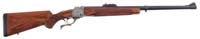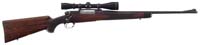 *MAUSER DIPLOMAT MODEL 66 BOLT ACTION RIFLE. Cal. .458 Win mag. SN G17331. Beautiful sporting rifle with 25-1/2″ tapered rnd bbl, ramp front sight, missing the hood, and dovetail mounted folding rear sight. It has the sliding breech short action with sliding breech block. It has coin finished receiver with deep Germanic style engraving of a bull and cow moose in a woodland/marsh scene on left side with two grizzly bears in a mountain scene on the right side. It is mounted in very nicely figured, 1-pc walnut stock with a white line spacer at the forend tip, with the tip having been cut from orig stock blank. It has skip line checkered forestock and pistol grip with Monte Carlo cheek piece, 14-1/4″ over a brown Decelerator pad. CONDITION: Very fine. Bbl retains about 98% strong orig blue with light muzzle edge wear and a few spots of pitting around the sight sleeve. Bolt handle shows high point wear and the sliding breech retains about all of its coin finish. Stock has a repaired chip in back of the receiver; otherwise the wood is sound and retains virtually all of its orig oil finish. Mechanics are fine. Bright shiny bore. 4-58146 JR240 (1,250-1,750)