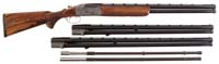 *EMILIO RIZZINI MODEL TRII OVER/UNDER SHOTGUN 2-BBL SET. Cal. 12 & 16 ga. SN A83740. Fine over/under with two sets of 26” superposed bbls with narrow, serrated, ventilated ribs, ejectors & gold-plated sgl selective trigger. The 12 ga. bbls have factory screw chokes, of which there are three: full, modified & improved cylinder. The 16 ga. bbls are choked FULL/MOD. Mounted with checkered, straight grain walnut with beavertail forearm & pistol grip stock, 14-5/8” over its orig thin waffle pad. Wrist has a palm swell on right side. Receiver is blue finish with light engraved decorations on sides. Accompanied by its orig, blue, Styrofoam lined cardboard box & an orig Rizzini plastic hard case, compartmented in bottom for all pieces of this shotgun. Also accompanied by its orig proof house papers and instruction manual. Drop at heel: 2-1/4”, drop at comb: 1-1/4”. Weight: 7 lbs. 8.32 oz. CONDITION: Extremely fine, near new, has been fired. Retains virtually all of its orig factory finish to both metal & wood. Stock has a couple of small dings on comb & a few other minor nicks & handling marks. Forearm appears to be without flaws. Mechanics are crisp, bright shiny bores. Box & case are equally new. 4-58385 JR333 (1,750-2,750)