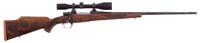 *MANNLICHER SCHOENAUER SEQUOIA MODEL BOLT ACTION RIFLE. Cal. 30-06. SN 515. Fine half stock sporting rifle with 24” tapered rnd bbl, ramp front sight with 3-leaf express rear sight, graduated 200-400 yards. Receiver is mounted with claw mounts with an adjustable base containing a Schmidt & Bender 4X36 scope. It has dbl set triggers. Mounted in straight grain walnut 1-pc stock with checkered forestock & semi-pistol grip, 13-1/2: over a soft Decelerator pad. Trigger guard is engraved with initials “W.O.J.” CONDITION: Very fine. Metal retains most of its orig factory blue with only slight muzzle edge wear and loss of finish on rear scope mount and cutoff. Trigger guard is a thin blue patina. Stock is sound with minor handling & use marks and a couple of small gouges near toe and retains most of its orig hand rubbed oil finish. Mechanics are crisp, bright shiny bore. Optics are crisp. 4-59210 JR692 (1,500-2,500)