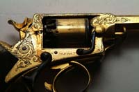 *ENGRAVED REMINGTON MODEL 32OO TRAP GUN. Cal. 12 ga. SN 32882. Spectacular custom engraved and gold inlayed trap gun with 30” vent rib bbls, choked FULL IMP/MOD. It has dbl beads with single selective trigger and ejectors. The wood is very nicely figured crotch cut walnut with checkered, large, square-end forearm and pistol grip stock, 14 1/2” over an original Brown Remington waffle pad. The original grip cap is mottled brown plastic. The receiver, trigger guard and forend iron are beautifully engraved in heavy Germanic style with vignettes of a pointer and three flushing pheasants all in raised gold in a field scene on the left side of the receiver. The right side has a similar vignette of a setter and three flushing quail in gold in a field scene and the bottom of the receiver has a smaller vignette of a raised gold retriever carrying a duck. The trigger bow has raised gold initials, in script, “DMS”. All the vignettes are outlined with gold wire and surrounded by about 80% coverage of foliate arabesque patterns with stippled background. The trigger bow, forend iron and about 1 1/2” up the top bbl and along with the flared sides of the mono block are identically engraved. The receiver, trigger guard, forend iron and sides of the mono lock are bright finished. CONDITION: Extremely fine. Retains most of its fine custom finish to both metal and wood with minor handling and storage marks with a couple of bruises on the buttstock. Lower bbl apparently has been opened to its current choke as it is marked “FULL”. Mechanics are fine. Brilliant shiny bores. A truly beautiful custom gun. 4-60273 (3,250-5,250)