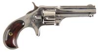 FRANCOTTE LITTLE PET DBL BBL DAMASCUS HAMMER SHOTGUN. Cal. 12 mm. NSN. Tiny dbl with 24″ Damascus bbls, tapered matted rib with sgl bead, doll’s head extension, dbl lug with extractors. Chambers appear to be about 1″. Rib is marked “AUGUSTE FRANCOTTE LIEGE”. It is mounted in highly figured French walnut with a tiny semi-schnable tipped checkered forearm & round knob stock, 12-3/4″ over a hard rubber buttplate with partridge in the center. Lockplates are marked “LITTLE PET” on each side & have scattered flourishes of arabesque pattern engraving on each side, on the receiver & trigger guard. Drop at the heel 2-3/4″, drop at the comb 1-1/2″. Weight: 3 lbs. 2.6 oz. CONDITION: Very fine. Bbls retain most of their orig brown Damascus pattern with slight muzzle wear and a couple of cleaned spots on the right side. Receiver & lockplates retain traces of case colors in the sheltered areas with the balance turned silver. Stock has a couple of tiny chips back of the top tang, otherwise the wood is sound with light nicks & scratches and retains most of its orig varnish finish. Mechanics are fine, bright shiny bores with some fine pitting in front of the chambers. 8-87365 (2,750-3,750)