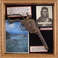UNIDENTIFIED FLINTLOCK MARTIAL PISTOL. NSN. 72 Cal. 9” rnd bbl. No markings of any kind. The brass fittings appear to be British but the styling of the lockplate and stock without tailpipe indicates possible Colonial assembly. A very large rear lockplate screw has been installed probably to adapt this lock to this stock. CONDITION: Moderate to heavy pitting overall. Chips out of the stock, around the lock and at the rear triggerguard end which has been broken and filled with a braze. Stock has been repaired and refinished. 4-59170 FS623 (2,250-3,500)