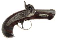 FLINTLOCK DOUBLE BARREL POCKET PISTOL. NSN. 44 Cal. 3-1/4” ribbed bbls. The locks are lightly engraved with dogs chasing running animals. The bbl rib is engraved with scrolls, the triggerguard with flowers and the buttcap with lines. The ramrod is a period replacement. CONDITION: All the metal has been polished bright, but the engraving is still sharp. Carving at the rear of the bbls is still sharp, but there is some cracking with slivers missing along the forearm. Mechanically fine. Wm. Hancock Collection 4-58610 (1,000-1,500)
