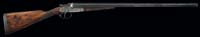 CASED R.B. RODDA DOUBLE RIFLE. Cal. 16 Bore. SN 838. Beautiful dbl rifle with 28” bbls, smooth, flat rib with tiny front sight and engraved 4-leaf rear sight graduated 50-200 yards. Front half of rib is hand matted & rear half is marked in gold Old English script “R.B. RODDA & CO. GUN MAKERS BY APPOINTMENT LONDON & CALCUTTA”. It has extractors with dbl underbites. Receiver is a rnd action with Purdey’s Patent bolt & thumb lever in front of trigger guard and marked on water table “PURDEY’S PATENT BOLT”. It has back action peninsula locks with stalking safeties. Mounted with very nicely figured, streaky, French walnut with full checkered, splinter forearm secured with a sgl wedge and pistol grip stock with small cheekpiece, 14-1/2” over a steel shotgun buttplate. Receiver, lockplates & all appended metal parts are beautifully deep relief engraved with foliate & vine patterns and a fine stippled background. It has maker’s name in a ribbon on each lockplate. It appears that all metal, at one time, was gold washed as there are traces of gold in very sheltered areas. Buttplate is also beautifully engraved in Moorish patterns with a fine background. Bbls have a safari sling eye with a corresponding eye in buttstock. Grip cap is oval steel with scalloped edge, engraved to match. Accompanied by an orig, red velvet lined, oak & leather Rodda casing with inside of lid embossed in gold with all the maker’s information. Bottom is compartmented for the two pieces of the rifle and a complete set of ivory handled tools by Hawksley. The tools also include an orig Davis nutcracker style mold. CONDITION: Fine to very fine. Bbls retain 85-90% thin orig blue. Receiver, with traces of orig gold wash, retains a smooth, even blue/brown patina. Stock has a small chip back of top tang with a sliver missing from left side of forearm at bbl channel; otherwise wood is sound with minor handling & use marks and a long rub by buttplate. It retains most of its orig factory finish with some dark oil staining around receiver & lockplates. Mechanics are crisp, bright shiny bores. Case exterior is soiled and water stained, missing some leather from top front of lid, but is completely sound & serviceable. Interior shows moderate to heavy wear with soil & some loose partitions. Tools & implements are all fine; retain most of their orig gold wash with a cracked handle on one or two pieces and case trimmer with its ivory handle cut off. Mold retains 60-70% bright orig blue. 4-59037 JR427 (5,000-8,000)