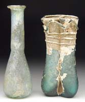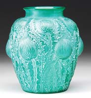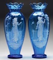MISC. GLASS. Lot consists of: 1) Large green glass vase with heavy enamel decoration of Middle Eastern design. Vase is finished with a gold band at the lip and the foot. 2) Pair of amethyst vases, each with a pressed overlapping stylized leaf design and long flat handles on each side. SIZE: Vase 7-1/2″ h. Each vase 5-3/4″ h. CONDITION: Very good. 13-9307 13-9312 (50-100)