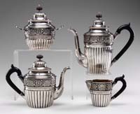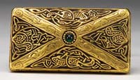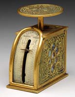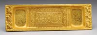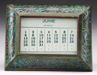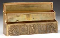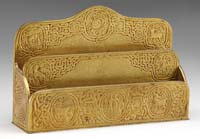 EIGHT-PIECE DESK SET. Nice bronze eight-piece desk set has desk blotter with four bronze corners, pen tray with double pen holders, letter knife, bronze 6″ ruler, paper tray with lid, rocker blotter, and tape dispenser. Desk set is marked “Silver Crest Genuine Bronze”. The letter knife is not original to set and is marked “Bradley & Hubbard”. SIZE: Blotter 16″ x 21″. Paper tray 10″ x 14″. Pen holder 5″ x 12″. CONDITION: Very good with some minor discoloration to finish. 13-9326 (100-200)