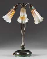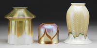 THREE DECORATED ART GLASS SHADES. Two having white snakeskin design and one in a rare zipper pattern in green and white, all on gold iridescent grounds. One shade is signed “Quezal” and the other two are unsigned. SIZE: 4-1/2″ t to 6″ t. CONDITION: Overall good, one with grinding to rim and other with minor chips to fitter rim. 5-66835 (400-600)