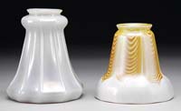 THREE IRIDESCENT ART GLASS SHADES. Decoration on shades is green, white and gold pulled feather on an iridescent gold background. There is applied gold threading and each has a scalloped edge. One is signed “Lustre Art”, one is signed “Quezal” and one is unsigned. SIZE: Approx. 5-1/8″ t x 2-1/4″ fitter. CONDITION: Very good to excellent with minor thread loss to each shade. 5-66344 (500-700)