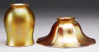 SIX IRIDESCENT GOLD SHADES. Six miscellaneous gold shades with brilliant iridescent gold finish and vertical ribbing. Two are signed with Steuben fleur de lis, two are signed “Quezal” and two are unsigned. SIZE: 5″ t to 5-1/2″ t and four have 2-1/4″ fitters and two have 3-1/4″ fitters. CONDITION: Very good to excellent with teeny bit of roughness to the fitter rims. 5-66837 (400-600)