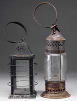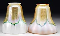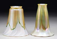 TWO ART GLASS SHADES. Green pulled feather corset-shaped shades with gold iridescent outline against a cream colored background. Interior of shades are finished with bright gold iridescence. One shade marked with Steuben fleur de lis and other shade is unsigned. SIZE: 3-1/2″ t and 3-1/4″ x 2″1-4″ fitters. CONDITION: Very good to excellent with minor roughness to both fitter rims. 5-66434 5-66452 (600-800)