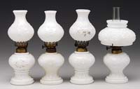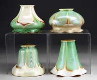 FOUR ART GLASS SHADES. All four shades are decorated with a gold wavy band on a white opalescent background. All have a gold iridescent interior finish and slight vertical ribbing. Three are signed on the fitter rim “Quezal” and one is signed on the fitter “Lustre Art”. SIZE: Quezal shades are 5-1/4″ t, Lustre Art shade is 5″ t x 2-1/4″ fitter each. CONDITION: Very good to excellent with one shade having a fitter flake. 5-66413 (800-1,200)