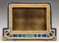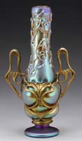 GOLD IRIDESCENT ART GLASS VASE. Interesting Art Nouveau style vase has bright gold iridescence and random heavy organic looking threading. Vase is blown into a gilded metal Art Nouveau style frame and rests atop an applied iridescent foot with nice purple highlights. Vase has a spurious Tiffany signature on the underside. It is not Tiffany. SIZE: 12″ h. CONDITION: Very good to excellent. 13-9350 (75-125)