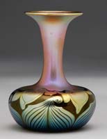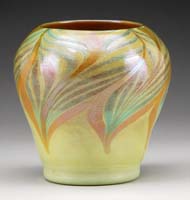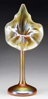 IRIDESCENT ART GLASS JACK IN THE PULPIT. Iridescent gold jack in the pulpit vase with pulled feather decoration, applied button pontil. Unsigned. SIZE: 12″ t. CONDITION: Very good to excellent. 5-70839 (300-500)