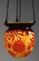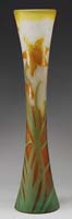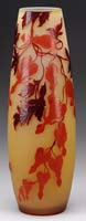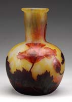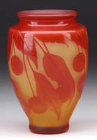 ACID ETCHED VASE. Red shading to a yellow then shaded to orange with an acid etched decoration circular leaves. Signed on side in cameo “Legras”. SIZE: 6″ t. CONDITION: Very good to excellent. 5-65355 (25-50)
