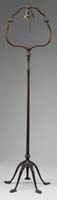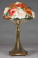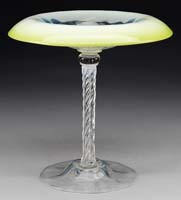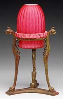 FOUR MISC ART GLASS SHADES. Including one squat form shade with diamond quilted background and a platinum feather decoration with highly unusual green threads of glass. Along with a Durand Moorish torchiere shade in gold. Third shade begins with a bright pink background with a platinum feather decoration overall and the last being a green pulled feather decorated shade on ivory. All shades are unsigned. SIZE: 4″ t to 10″ t. CONDITION: Very good with minor grinding and chips to fitter rims. 5-66834 (500-700)