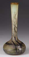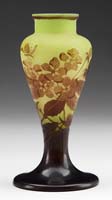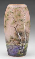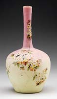 KIMBALL DURAND ENAMELED VASE. Nice Kimball Durand vase has enameled decoration of purple branches, brown leaves and lavender flowers against a background of pink shading to cream. Signed on underside “DK” within ground pontil. SIZE: 5-3/4″ h. CONDITION: Tight 1-1/2″ hairline at foot. 13-9357 (25-50)