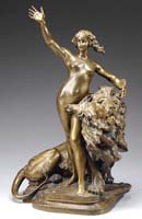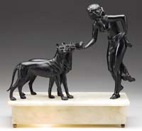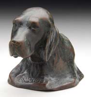 MISC. FIGURINES. Lot consists of: 1) Pair of bronze cold-painted Irish wolfhounds with cream colored coats. Each figure is mounted on a copper-covered plaster base. 2) Figural ashtray in cold-painted bronze depicts ashtray with smoldering cigarette and a parrot perched alongside the match holder staring down at the cigarette. Signed on the back but illegible. 3) Plaster-cast crouching hippopotamus with a painted green glaze and impressed “Isard 59/100”. SIZE: Hippo 9-1/2″ l. Each dog 6-1/2″ l. Ashtray 5-3/4″ l. CONDITION: Some wear to finish on all items, otherwise good. 13-9306 13-9309, 13-9310 (50-100)